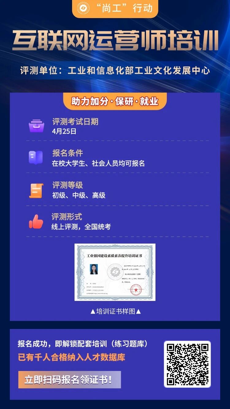 【互联网运营师】工信部工业文化发展中心颁发证书,大学生可考,线上考试,真题模拟 ||考试时间:2026年4月25日;主办单位:工业和信息化部工业文化发展中心