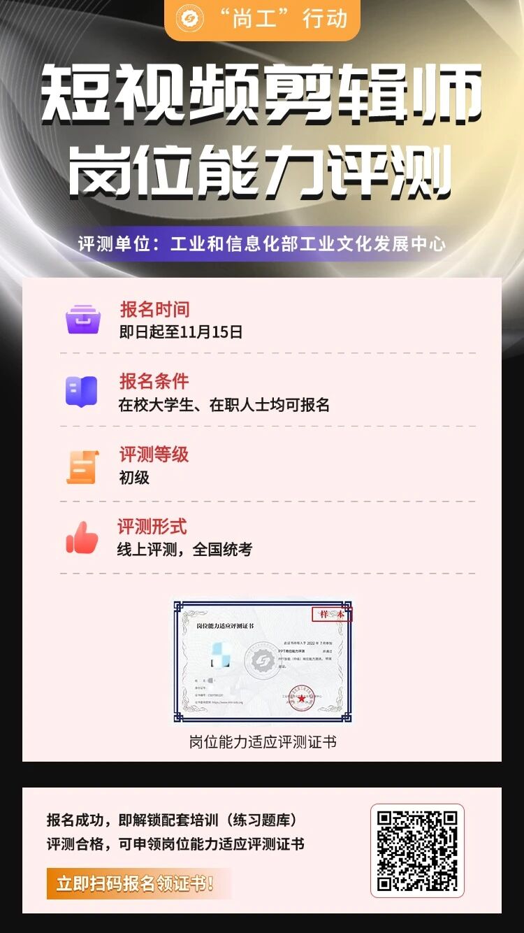 【短视频剪辑师证书】工信部工业文化发展中心主办,在校生即可报名,线上考试有题库! || 主办单位:工业和信息化部工业文化发展中心 || 考试时间:2025年11月15日