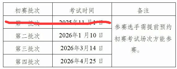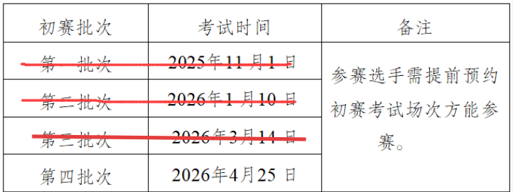 初赛共设置4个考试批次,定期举行全国统考,参赛选手可以预约就近开放的考试场次。