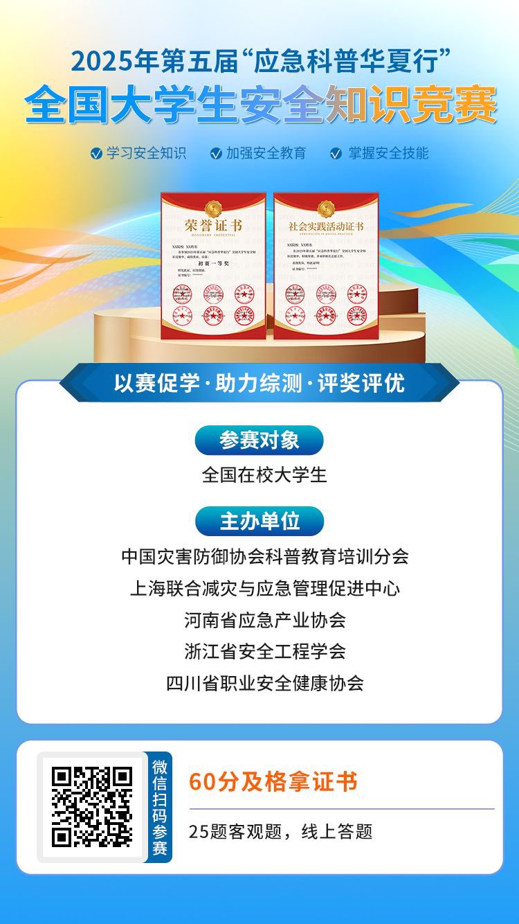 鉴于此,中国灾害防御协会科普教育培训分会联合上海联合减灾与应急管理促进中心、河南省应急产业协会、浙江省安全工程学会、四川省职业安全健康协会共同举办2025年第五届“应急科普华夏行”全国大学生安全知识竞赛,欢迎各广大学生踊跃参加。