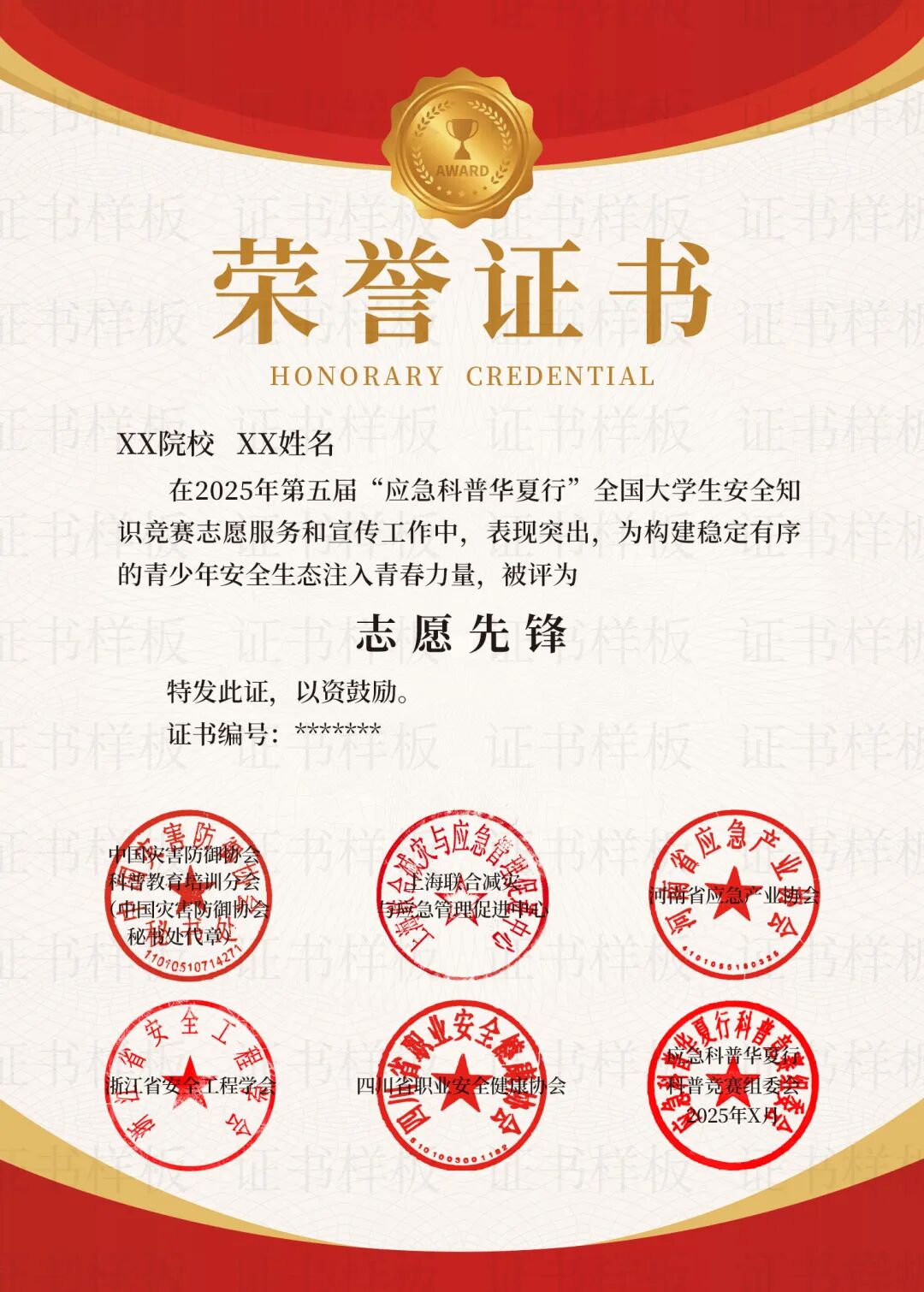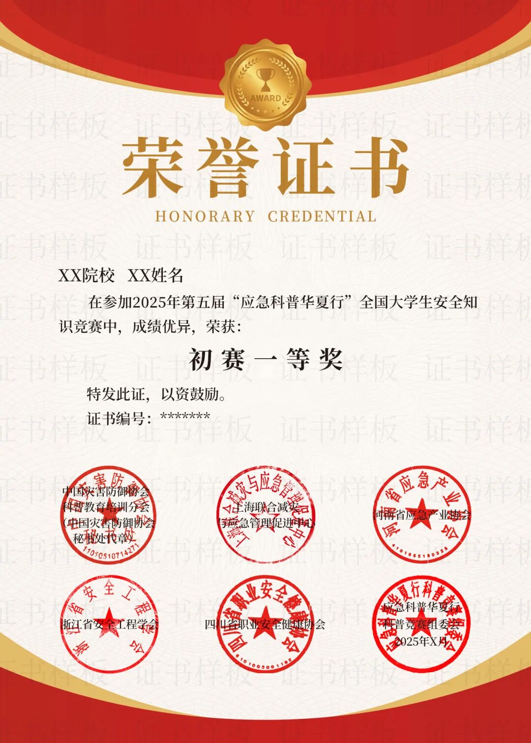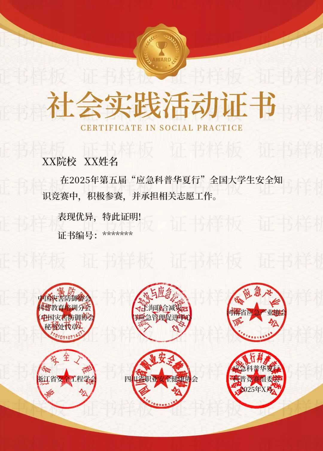 参加竞赛时,系统将随机从题库中抽取25道试题供参赛人员作答,其中含单选题15道、多选题5道、判断题5道,每道题分值4分。参赛者完成答题且得分大于等于60分即合格,答题合格者,可根据答题结束后页面提示获得《2025年第五届“应急科普华夏行”全国大学生安全知识竞赛》电子版荣誉证书,可作为评奖评优及社会实践活动的证明。