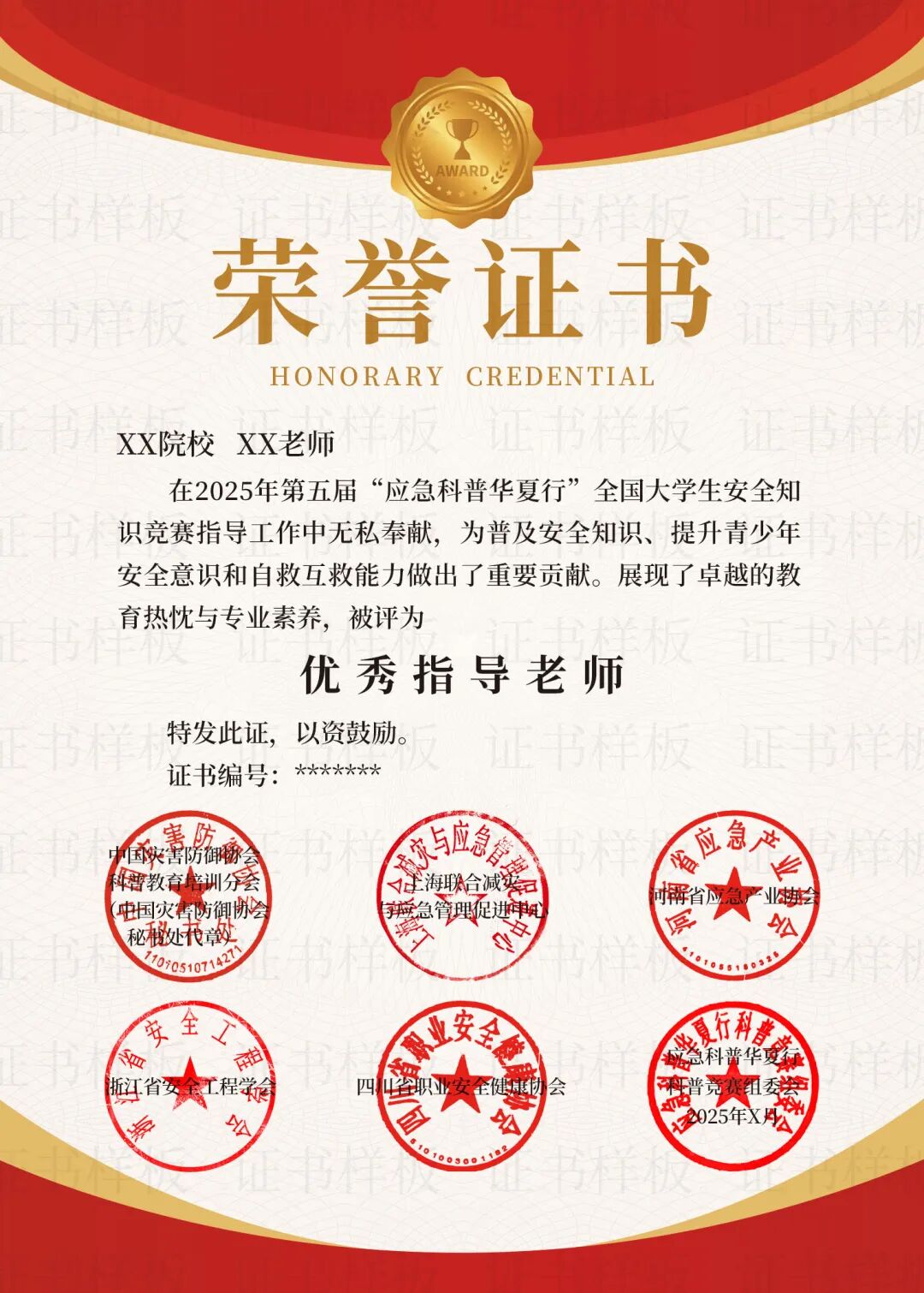 比赛设“优秀指导教师奖”。组织报名且成功完成比赛的学生人数达到50人及以上的教师,将被授予“优秀指导教师”,颁发纸质版证书。