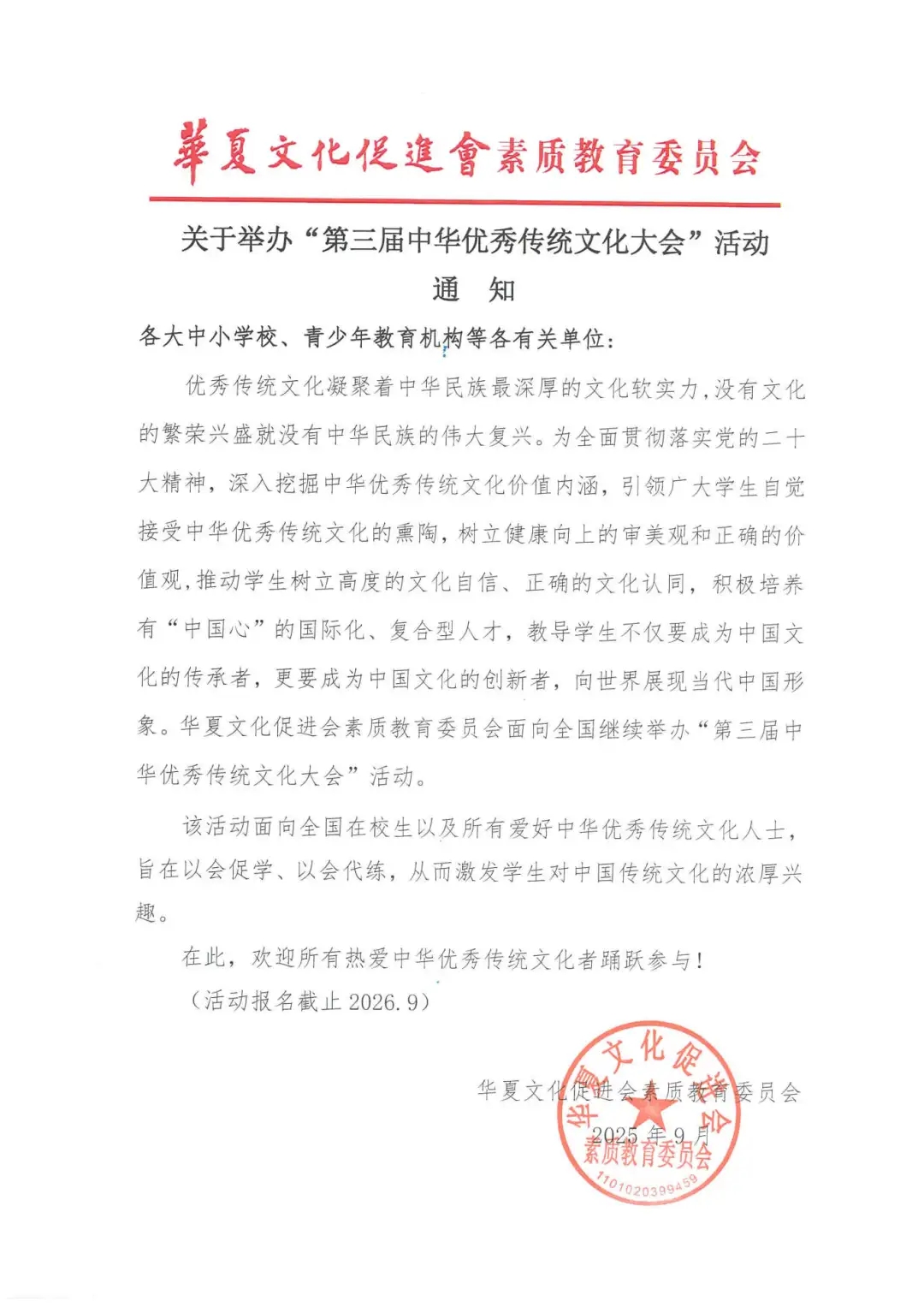 为全面贯彻落实党的二十大精神,深入挖掘中华优秀传统文化价值内涵,引领学生自觉接受中华优秀传统文化的熏陶,树立健康向上的审美观和正确的价值观,推动学生树立高度的文化自信、清晰的文化自觉和正确的文化认同,特继续举办第三届中华优秀传统文化大会。本次活动旨在培养有"中国心"的国际化、复合型人才,教导学生不仅要成为中国文化的传承者,更要成为中国文化的创新者,向世界展现当代中国形象。