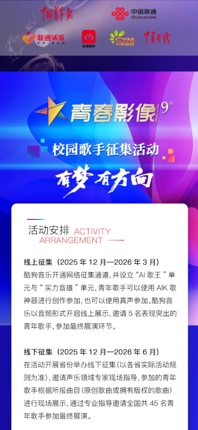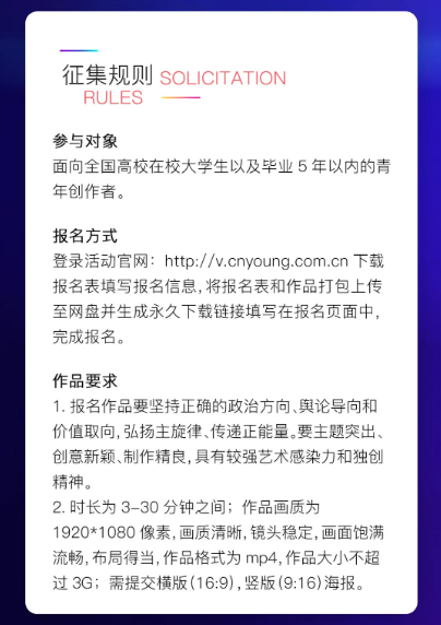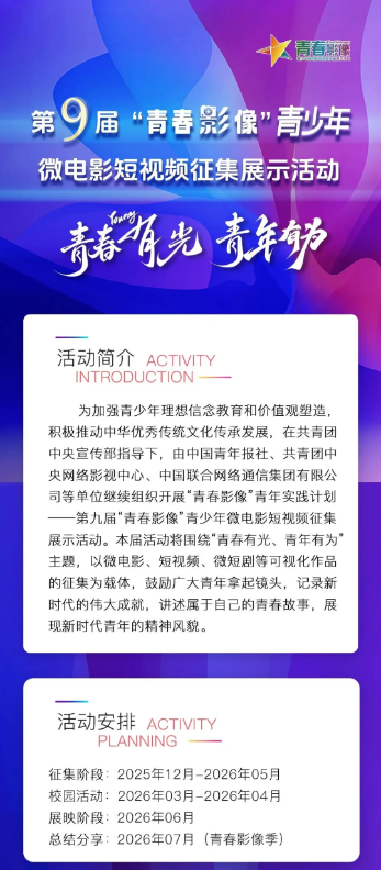 诚邀广大青年以青春为笔、以创意为墨,用影像定格热血瞬间,用歌声传递追梦力量,讲述青春故事,解锁高光时刻!