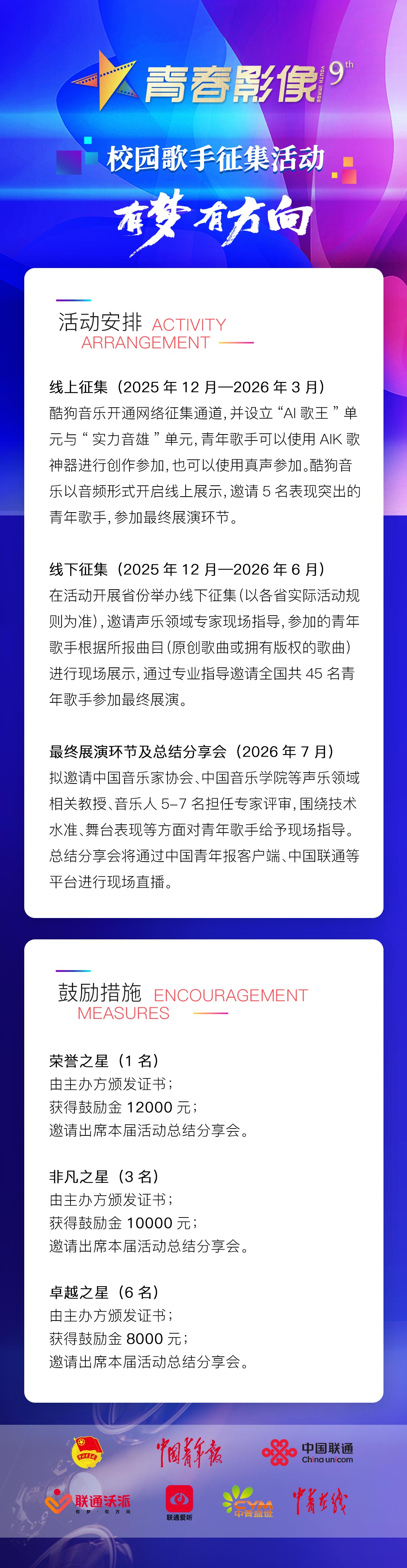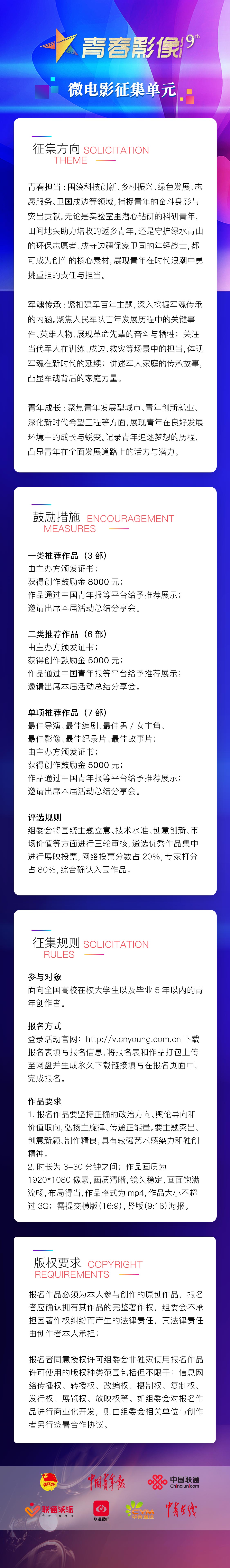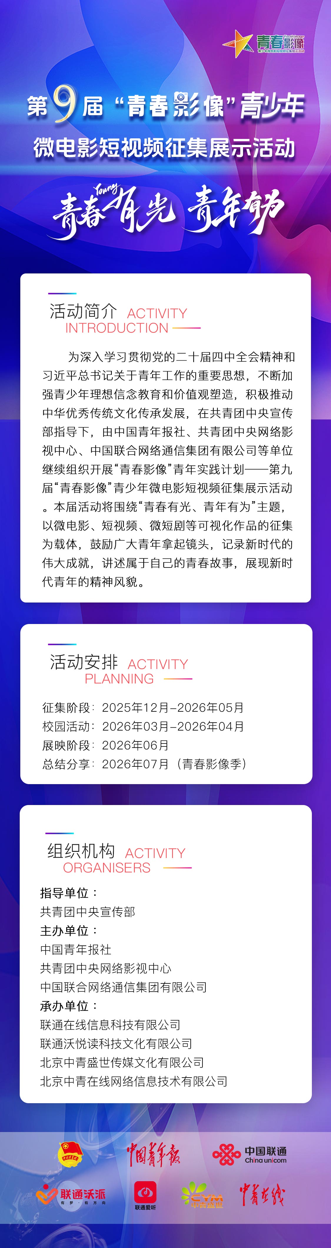在共青团中央宣传部的指导下,由中国青年报社、共青团中央网络影视中心、中国联合网络通信集团有限公司主办,联通在线信息科技有限公司、联通沃悦读科技文化有限公司、北京中青盛世传媒文化有限公司、北京中青在线网络信息技术有限公司等单位共同承办的第九届“青春影像”青少年微电影短视频征集展示活动正式启动征集!