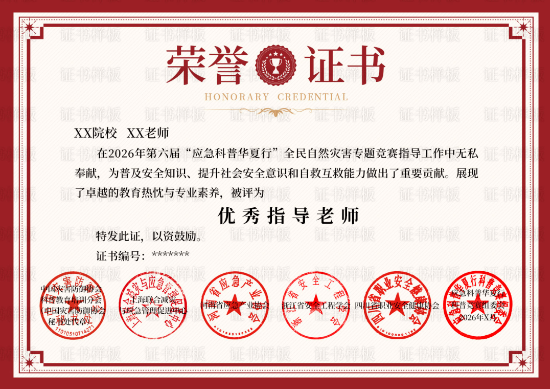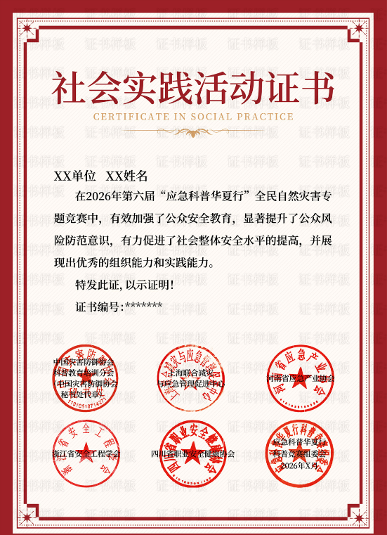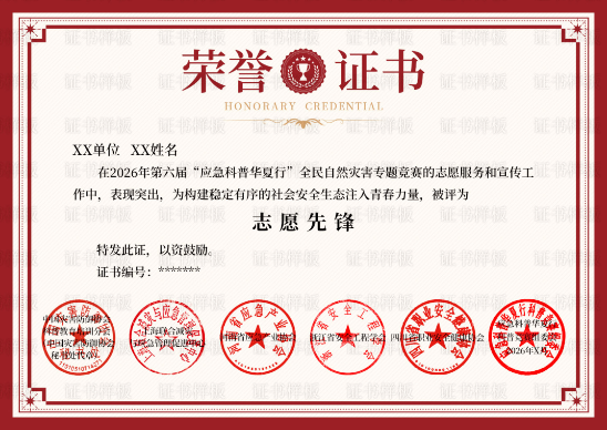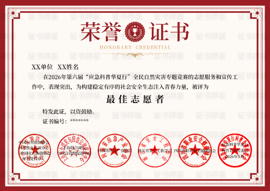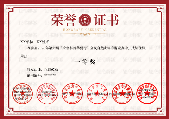 参加竞赛时,系统将随机从题库中抽取25道试题供参赛人员作答,其中含单选题15道、多选题5道、判断题5道,每道题分值4分。参赛者完成答题且得分大于等于60分即合格,答题合格者,可根据答题结束后页面提示获得《2026年第六届“应急科普华夏行”全民自然灾害专题竞赛》电子版荣誉证书,可作为评奖评优及社会实践活动的证明。