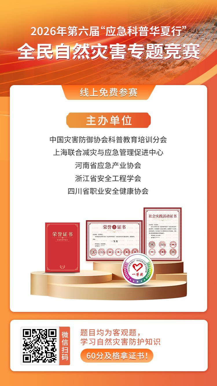 鉴于此,中国灾害防御协会科普教育培训分会联合上海联合减灾与应急管理促进中心、河南省应急产业协会、浙江省安全工程学会、四川省职业安全健康协会共同举办2026年第六届“应急科普华夏行”全民自然灾害专题竞赛,欢迎各广大参赛者踊跃参加。