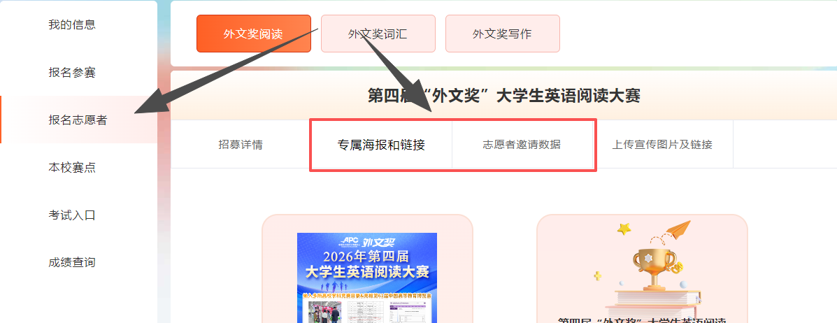 报名方式: 登陆外文奖系列赛事官网-注册信息—点击侧边栏志愿者—选择相应赛项—下载专属海报或链接