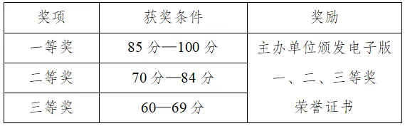 大赛形式为知识竞赛,答题时长30分钟;赛题25道,题型为选择题和判断题;每题4分,共计100分,60分以上均可获得不同等级奖项荣誉证书。竞赛平台提供免费模拟练习。