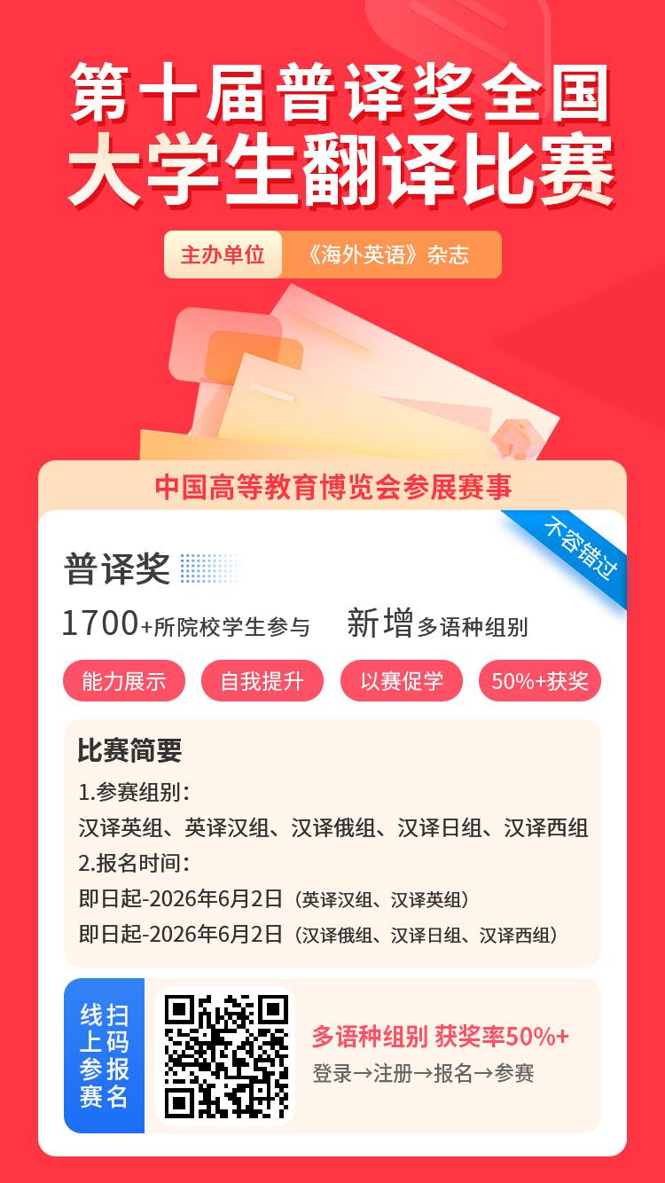 在新时代国家对外开放战略和“一带一路”建设的背景下,为促进大学生外语教育教学活动的开展,推动形成高素质国际化复合型人才培养、选拔、推送、使用的全链条,培养和储备“一精多会、一专多能”的国际化人才,“普译奖”系列赛已成功举办九届普译奖全国大学生翻译比赛。作为外语类品牌赛事,“普译奖”系列赛面向广大高校学生,受到了各高校及外语研习机构的广泛好评。2026年第十届普译奖全国大学生翻译比赛在此基础上由《海外英语》杂志联合我爱竞赛网主办,邀请各高校外语研究机构共同协办。
