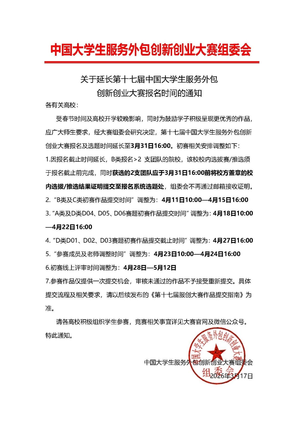 为进一步聚焦服务业创新发展,加快服务外包人才培养工作,促进大学生就业和创业,定于2026年2至2026年8月举办第十七届“ 中国大学生服务外包创新创业大赛”(以下简称“大赛”)。现将有关事项通知如下: