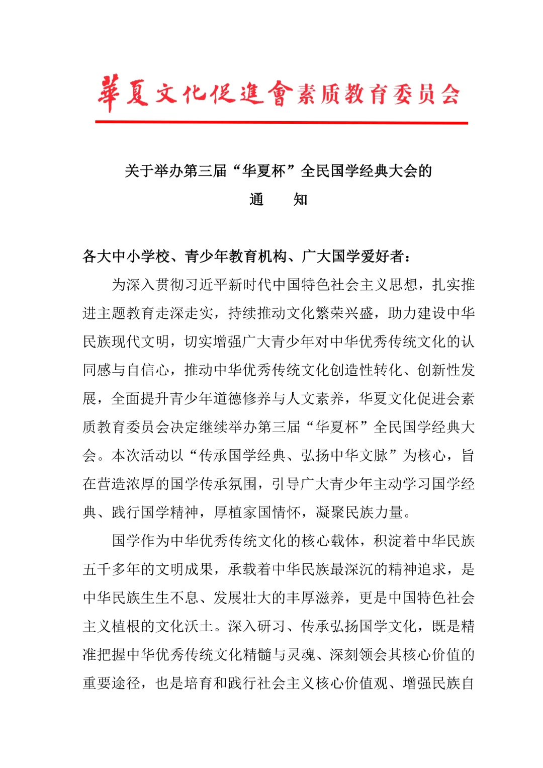 为进一步推进学习贯彻习近平新时代中国特色社会主义思想主题教育走深走实,继续推动文化繁荣,建设中华民族现代文明,增强广大青年对中华文化的认同感和自信心,推动中华优秀文化创造性转化、创新性发展,培养广大青年的道德修养和人文素养。华夏文化促进会素质教育委员会特继续主办2026年第三届“华夏杯”全民国学经典大会活动。